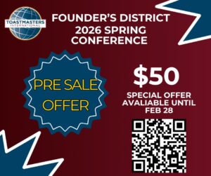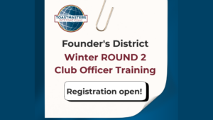 - January District Challenge!Founder’s District Toastmasters – January District Challenge 101 Miles for 101 Years: A Toastmasters Awareness [Read More]