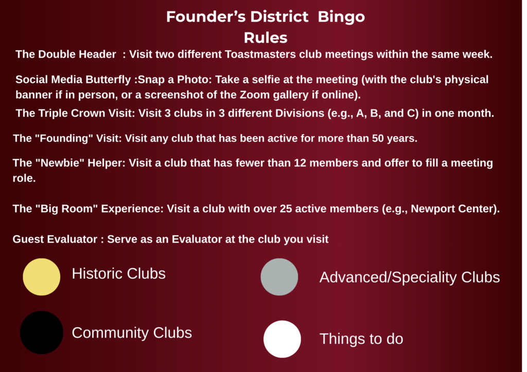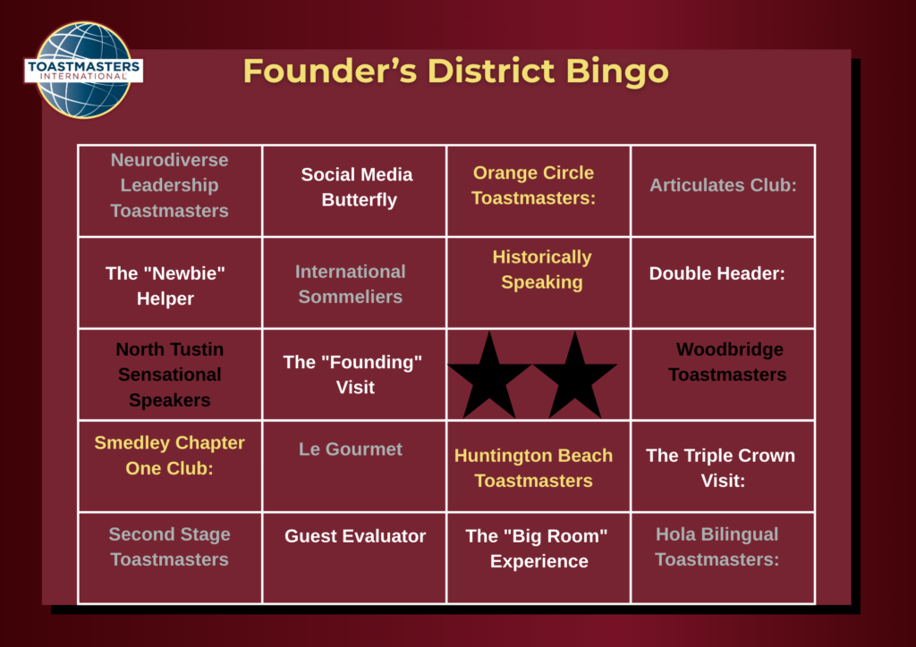Toastmasters, it’s time to explore the incredible diversity of our District! Whether you’re looking for a specialized “Historic” club visit or a Saturday morning specialty meeting, here is your verified guide to the clubs on your Bingo board, updated for Spring 2026!